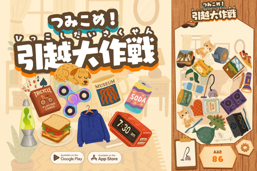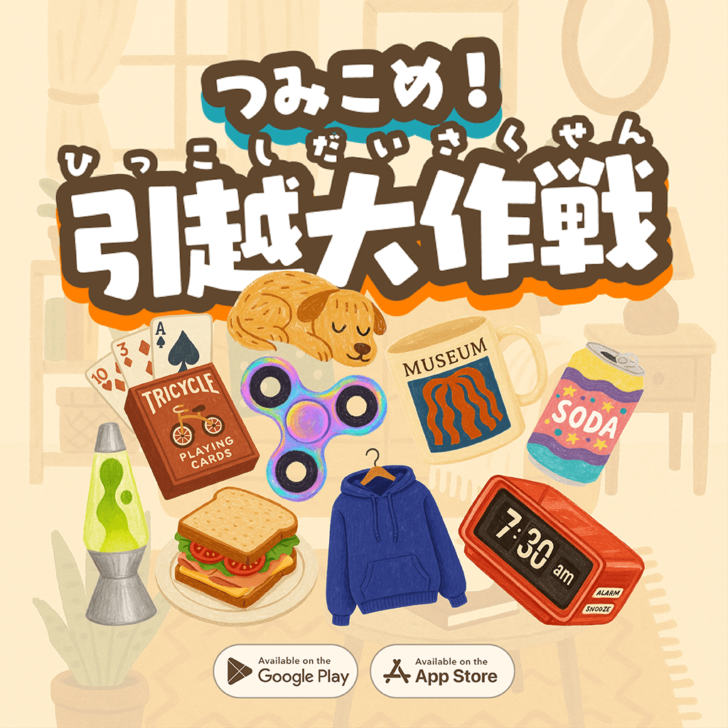 降りそそぐ荷物をさばけ!瞬発力勝負の引越しバトル。『つみこめ!引越大作戦』は山ほど降ってくる引越しアイテムの中から、指定のアイテムを素早く見つけてタップするゲームです。タップしたアイテムは消えてスッキリ、でものんびりしてるとどんどん積み上がっていく…。画面のてっぺんまで積み上がったらゲームオーバー!シンプルなルールなのに、集中力と瞬発力が試されるスリル満点のハイパーカジュアルゲーム。キミはどこまでつみこめる?